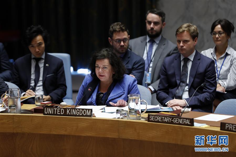 9月18日,在位于纽约的联合国总部,英国常驻联合国代表皮尔斯(中)在安理会叙利亚政治和人道局势公开会上发言。 新华社记者 李木子 摄