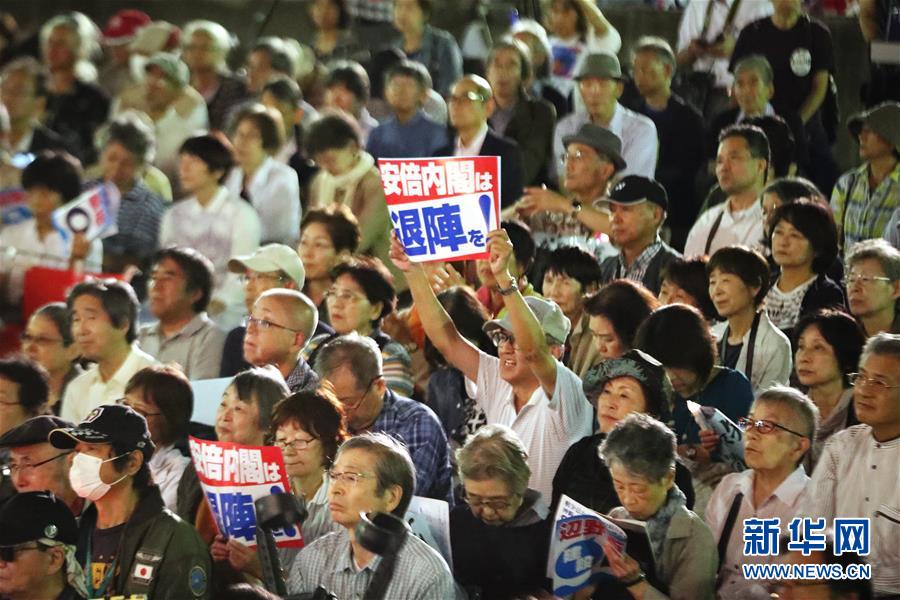 9月19日,在日本东京,一名民众手举标语参加集会。当日,近5000人在东京日比谷公园内参加反对新安保法集会。新华社记者 杜潇逸 摄