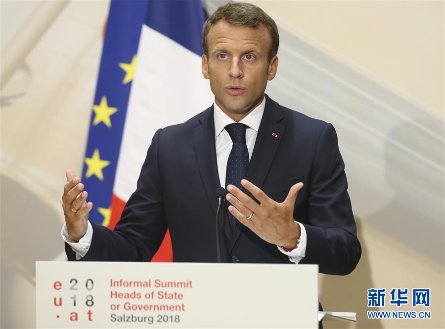 9月20日,在奥地利萨尔茨堡,法国总统马克龙出席新闻发布会。 为期两天的欧盟萨尔茨堡非正式峰会20日落幕。此次峰会主要讨论了移民、内部安全和英国“脱欧”等问题。 新华社记者 叶平凡 摄
