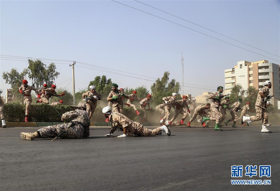 9月22日,在伊朗胡齐斯坦省首府阿瓦士,士兵们躲避袭击。 一伙武装人员22日在阿瓦士举行的纪念两伊战争爆发38周年阅兵仪式上实施袭击,迄今已造成至少24人丧生、53人受伤。 新华社发
