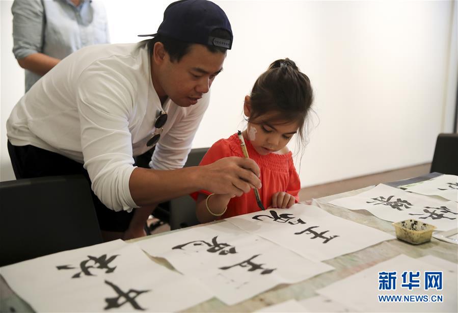 9月22日,在美国纽约华人博物馆,一名儿童学写中国书法。 当日,纽约华人博物馆举行中秋节文化体验活动,孩子们学习中国书法、听中秋故事、制作皮影玩偶和月饼,体验中国传统文化。 新华社记者王迎摄