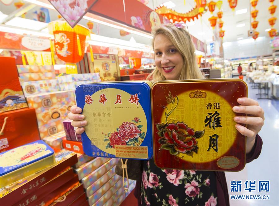 9月23日,在加拿大多伦多,一名顾客展示购买的月饼。 多伦多的华人超市推出月饼专柜,吸引了众多顾客。 新华社发(邹峥摄)