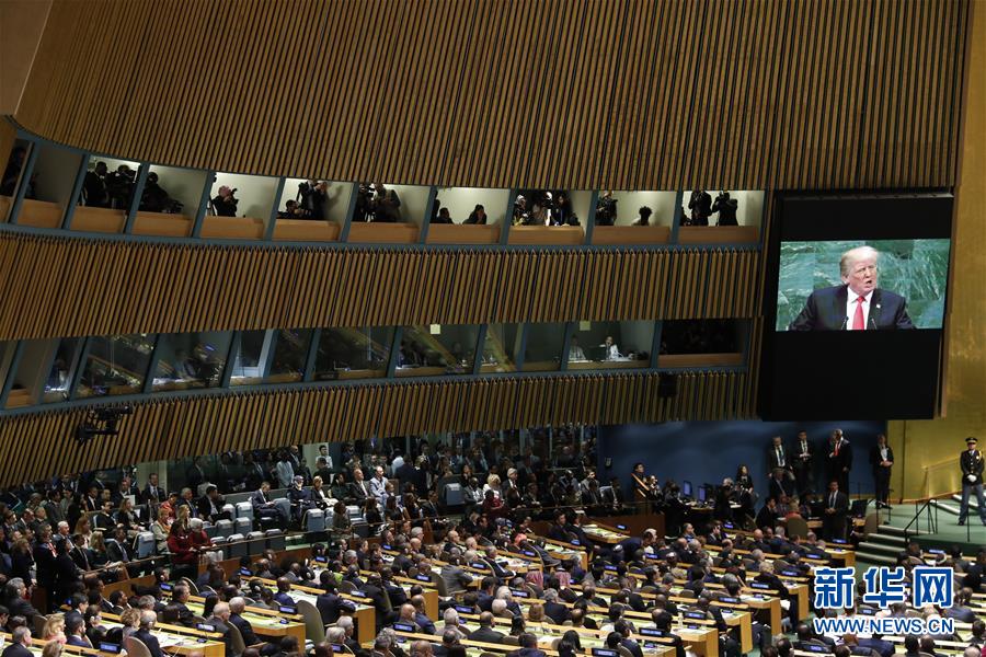 9月25日,在位于纽约的联合国总部,记者在媒体间拍摄在联合国大会一般性辩论上发表演讲的美国总统特朗普。 当日,美国总统特朗普在第73届联合国大会一般性辩论上发表演讲,为其上任以来奉行的“美国优先”政策辩护,并称反对全球主义理念。 新华社记者李木子摄