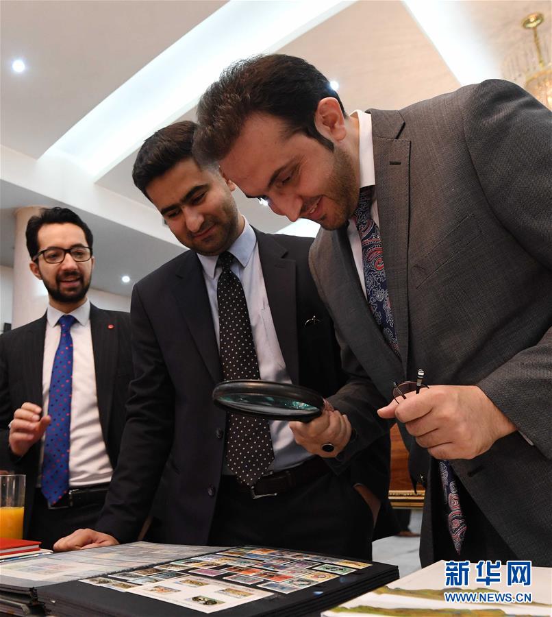 9月25日,在阿富汗喀布尔,嘉宾在中国驻阿富汗大使馆国庆招待会上欣赏邮票。 新华社记者代贺摄