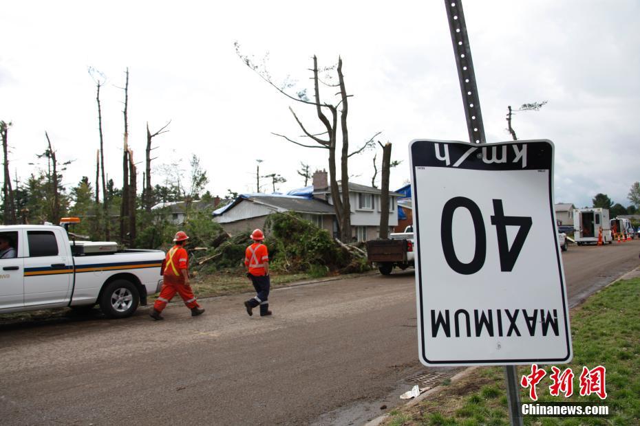 在灾情严重的渥太华阿灵顿伍德小区,金属交通牌被狂风撕毁;大量树木折断,树冠均被狂风吹落。 中新社记者 余瑞冬 摄