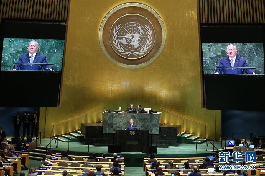 9月27日,在位于纽约的联合国总部,以色列总理内塔尼亚胡在联合国大会一般性辩论上发言。新华社记者秦朗摄