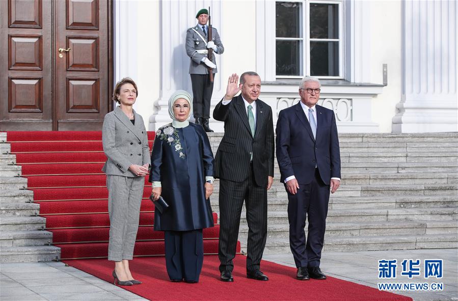 9月28日,在德国首都柏林的总统府,德国总统施泰因迈尔(右一)携夫人(左一)与来访的土耳其总统埃尔多安(右二)及夫人(左二)合影。 新华社记者单宇琦摄