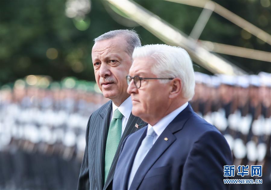 9月28日,在德国首都柏林的总统府,德国总统施泰因迈尔(右)与来访的土耳其总统埃尔多安检阅仪仗队后离开。 新华社记者单宇琦摄