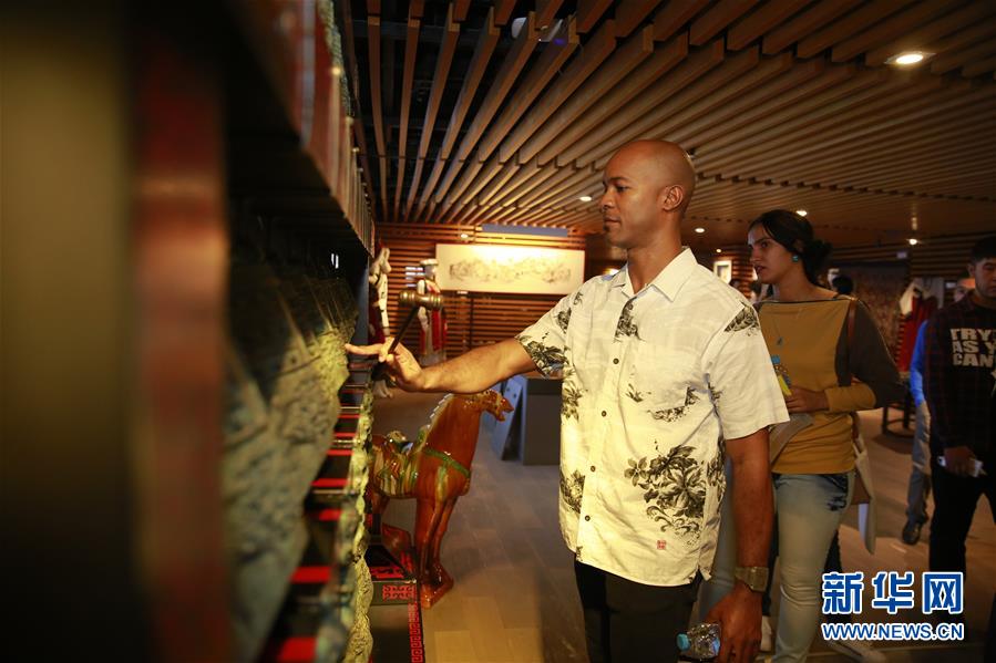 9月28日,在北京孔子学院总部举办的第五届“开放日”活动上,一位外宾体验演奏编钟。 新华社发