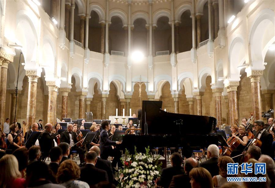 9月28日,在黎巴嫩首都贝鲁特市中心的圣约瑟夫教堂,中国知名旅美青年钢琴家元杰(中)在中国国庆主题音乐会上演奏。 新华社发(比拉尔·贾维希摄)