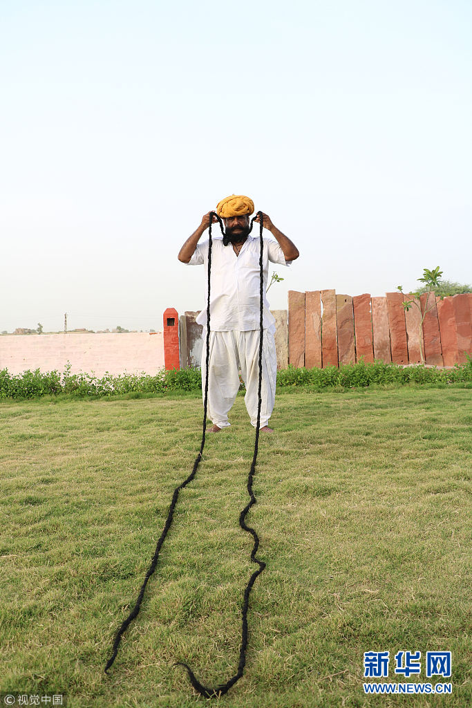 当地时间2018年8月4日,印度拉贾斯坦邦比卡内尔,拥有世界最长的胡子的印度人Girdhar Vyas与游客们合影。Girdhar Vyas从1985年开始蓄须,长达22英尺(约6.7米),打理起来也特别费劲,每天大概要花上3小时梳理抹油。(图片来源:视觉中国)