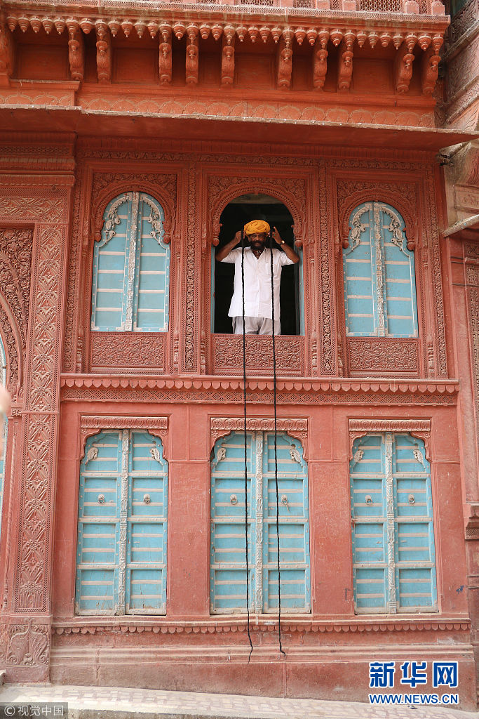 当地时间2018年8月4日,印度拉贾斯坦邦比卡内尔,拥有世界最长的胡子的印度人Girdhar Vyas与游客们合影。Girdhar Vyas从1985年开始蓄须,长达22英尺(约6.7米),打理起来也特别费劲,每天大概要花上3小时梳理抹油。(图片来源:视觉中国)