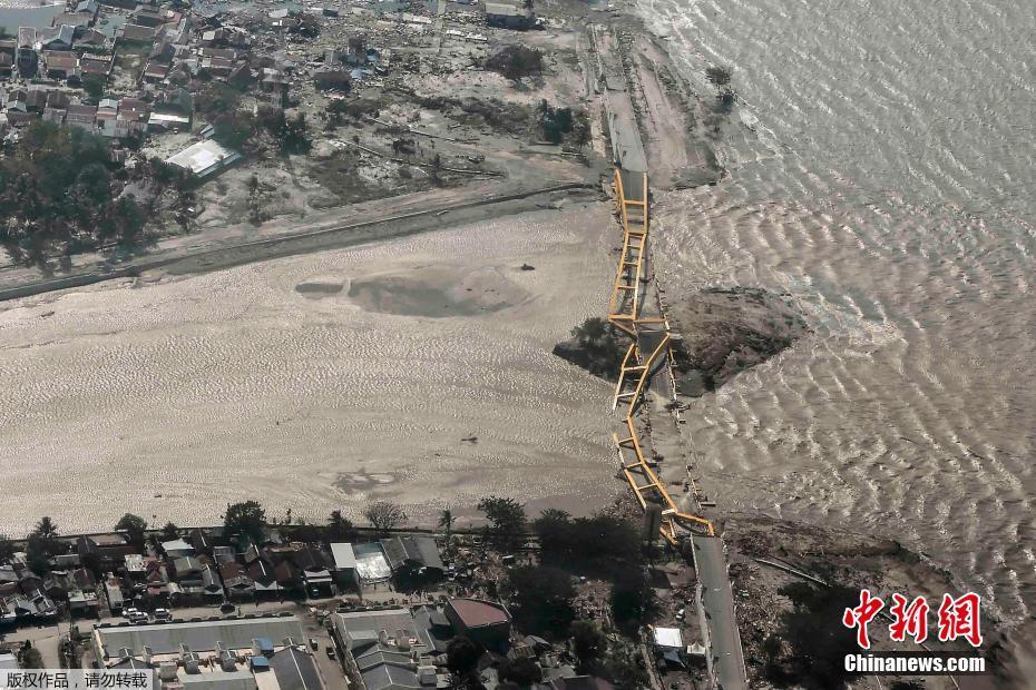 当地时间2018年9月29日,印度尼西亚巴路,一座被地震和海啸破坏的桥梁坍塌断成数节。