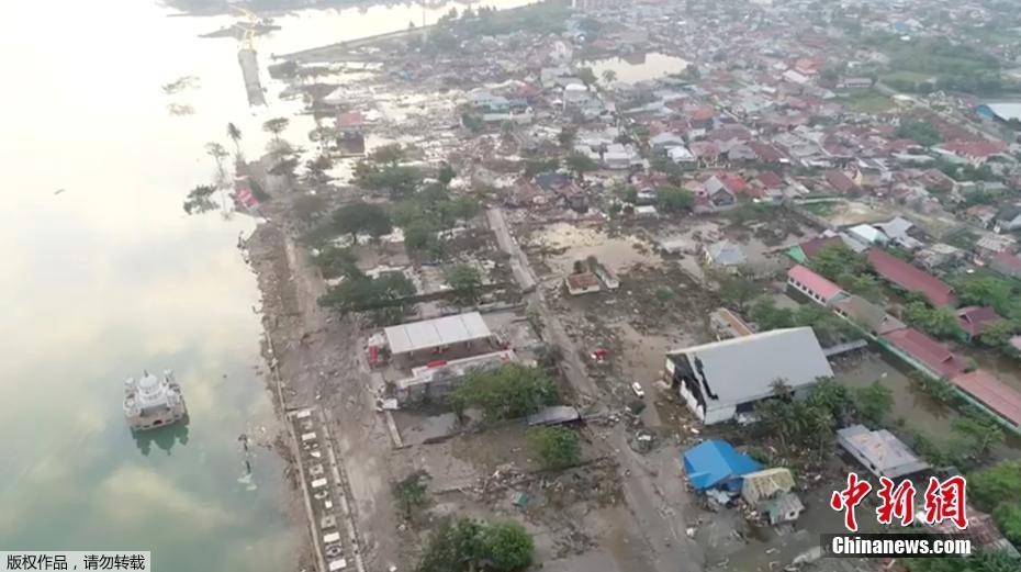 印度尼西亚苏拉威西岛遭7.5级强震侵袭并引发海啸,造成逾400人证实死亡,许多遇难者遭海啸卷走死亡。图为航拍受灾现场。