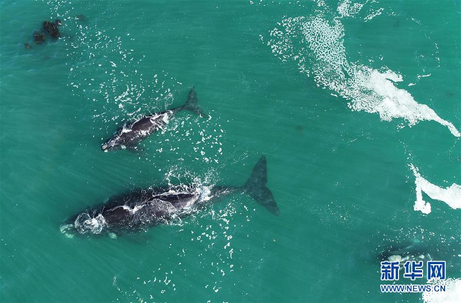 9月30日,在南非赫曼纽斯小镇附近海面上,南露脊鲸在海岸边畅游。 9月29日,位于开普敦以东约115公里的赫曼纽斯小镇迎来2018年的鲸鱼节,来自世界各地的游客可乘船出海观鲸,也可在岸边等待鲸鱼的到来。 新华社记者陈诚摄