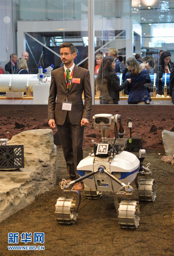 10月1日,在德国不来梅,参展商展示月球车。 第69届国际宇航大会1日在德国不来梅会展中心拉开帷幕,来自世界各地的6300多名宇航员、航天机构和企业代表、专家学者与青年学生等出席。 新华社记者 连振 摄