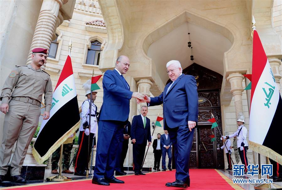 10月3日,在伊拉克首都巴格达,伊拉克新当选总统巴尔哈姆·萨利赫(中左)与卸任总统马苏姆握手。 伊拉克新当选总统巴尔哈姆·萨利赫与卸任总统马苏姆3日在总统府举行总统权力交接仪式。萨利赫在伊拉克国歌伴奏下检阅了总统府卫队,并与卸任总统马苏姆握手。 新华社发(哈利勒·达伍德 摄)