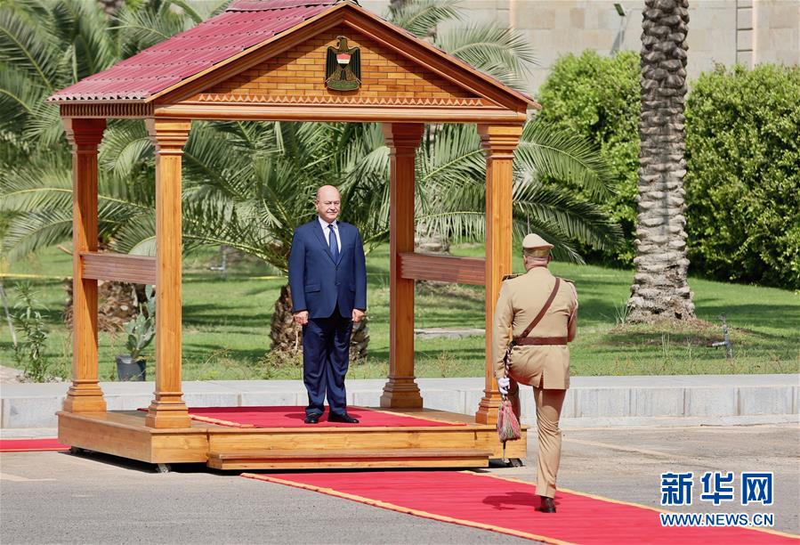 10月3日,在伊拉克首都巴格达,伊拉克新当选总统巴尔哈姆·萨利赫(左)检阅总统府卫队。 伊拉克新当选总统巴尔哈姆·萨利赫与卸任总统马苏姆3日在总统府举行总统权力交接仪式。萨利赫在伊拉克国歌伴奏下检阅了总统府卫队,并与卸任总统马苏姆握手。 新华社发(哈利勒·达伍德 摄)