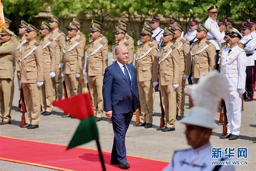 10月3日,在伊拉克首都巴格达,伊拉克新当选总统巴尔哈姆·萨利赫(中)检阅总统府卫队。 伊拉克新当选总统巴尔哈姆·萨利赫与卸任总统马苏姆3日在总统府举行总统权力交接仪式。萨利赫在伊拉克国歌伴奏下检阅了总统府卫队,并与卸任总统马苏姆握手。 新华社发(哈利勒·达伍德 摄)