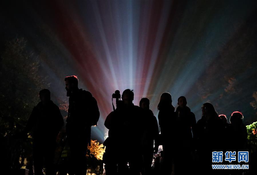 10月5日,在德国首都柏林,游客观赏灯光秀。