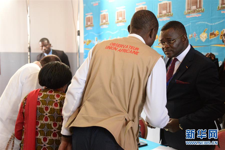 10月7日,在喀麦隆雅温得,一名非洲联盟观察员与投票站工作人员交谈。 当日,喀麦隆举行总统选举,共有9名候选人参与角逐。此次选举有注册选民660万,全国共设约2.5万个投票站。约1.9万名海外选民将在66个海外投票站投票。新华社记者乔本孝摄