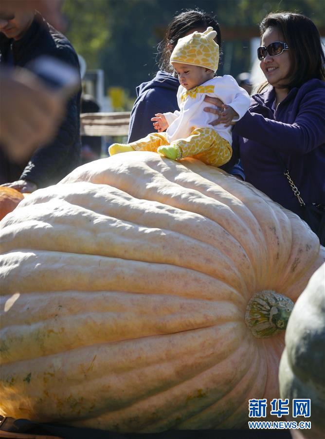 10月6日,在加拿大不列颠哥伦比亚省兰利市,一名婴儿坐在巨型南瓜上。加拿大不列颠哥伦比亚省兰利市6日举行巨型南瓜大赛,吸引当地数十位巨型南瓜种植者参赛,争夺最重南瓜大奖。新华社发(梁森 摄)