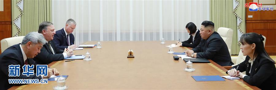 10月7日,朝鲜最高领导人金正恩(右二)在平壤与美国国务卿蓬佩奥(左二)举行会谈。
