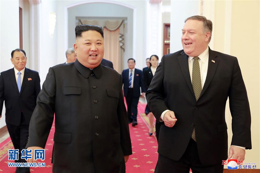10月7日,朝鲜最高领导人金正恩(前左)在平壤与美国国务卿蓬佩奥(前右)交谈。 新华社/朝中社