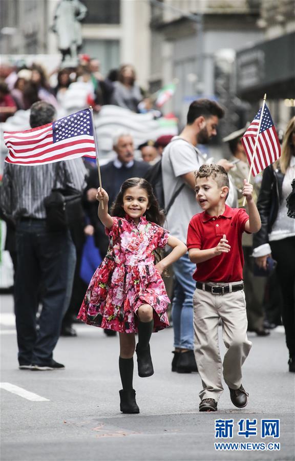 10月8日,在美国纽约曼哈顿第五大道,两名儿童参加哥伦布日游行。 新华社记者王迎摄