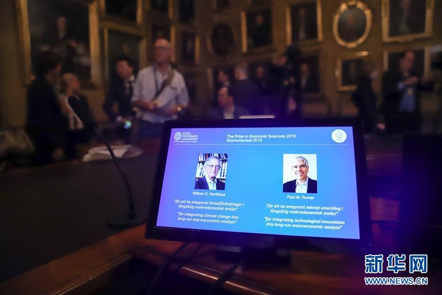 10月8日,在瑞典斯德哥尔摩,2018年诺贝尔经济学奖获奖者美国经济学家威廉·诺德豪斯(左)和保罗·罗默的照片显示在屏幕上。 瑞典皇家科学院8日宣布,将2018年诺贝尔经济学奖授予美国经济学家威廉·诺德豪斯和保罗·罗默,以表彰他们在可持续经济增长研究领域作出的突出贡献。 新华社发(曾尔惟摄)