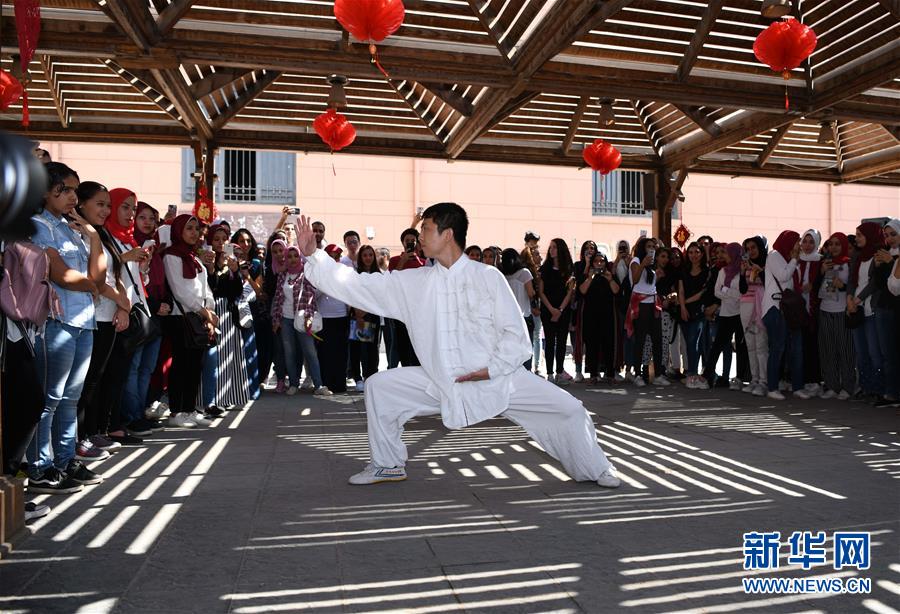 10月8日,在位于开罗的埃及博物馆内,开罗大学孔子学院一名教师表演武术。 开罗大学孔子学院文化日活动8日走进埃及博物馆,以书法、武术、剪纸等形式展示中国传统文化。 新华社记者邬惠我摄