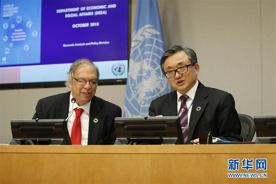 10月8日,在位于纽约的联合国总部,联合国负责经济和社会事务的副秘书长刘振民(右)向记者介绍《2018年世界经济和社会概览》。 新华社记者李木子摄