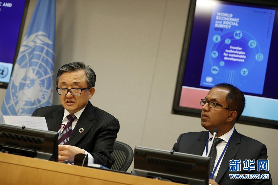 10月8日,在位于纽约的联合国总部,联合国负责经济和社会事务的副秘书长刘振民(左)向记者介绍《2018年世界经济和社会概览》。新华社记者李木子摄