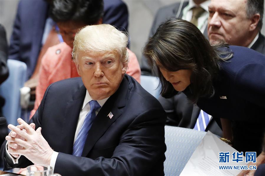 美国总统特朗普10月9日说,美国常驻联合国代表黑莉将于今年年底离职。特朗普当天在白宫与黑莉共同会见媒体时说,黑莉大约在6个月前就向他提出希望任职美国常驻联合国代表2年后离任,她将于今年年底离职。 这是美国常驻联合国代表黑莉(前右)与美国总统特朗普(前左)在位于纽约的联合国总部举行的安理会会议前交谈的资料照片(9月26日摄)。 新华社记者李木子摄