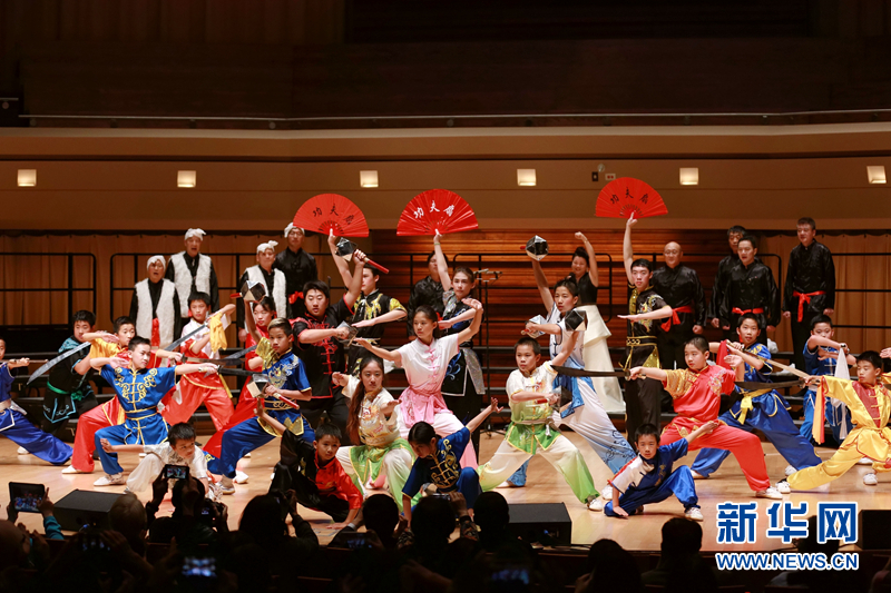 10月7日,在美国芝加哥,芝加哥华人艺术团和飞鹰功夫学校在音乐会现场联合演绎《牧羊曲》和《少林少林》。新华社记者 汪平摄