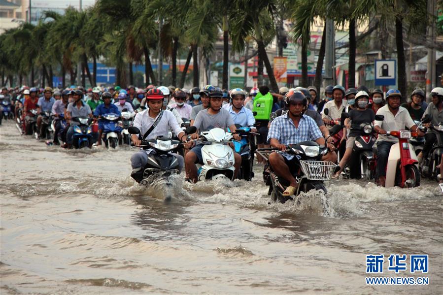 10月9日,在越南南部芹苴市,人们骑摩托车经过积水的道路。 新华社/越通社