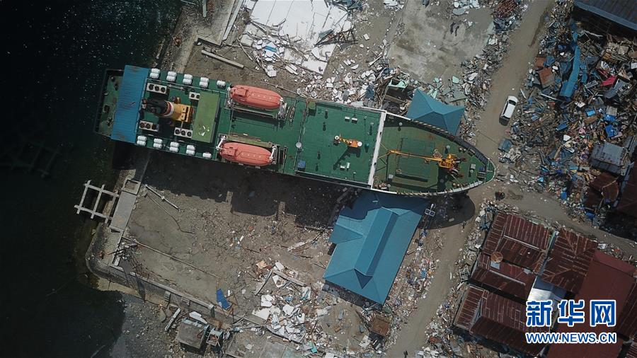 这是10月10日在印度尼西亚中苏拉威西省栋加拉县航拍的被海啸冲击到岸上的轮船。 当日,印尼抗灾署发言人苏托波称,中苏拉威西省9月28日发生的强烈地震及海啸已造成2045人死亡。 新华社发(王申 摄)