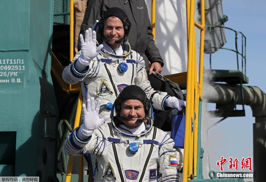 俄国宇航员阿列克谢·奥夫奇宁和美国宇航员尼克·黑格原计划在国际空间站驻守约半年。图为发射之前,两位宇航员亮相发射场。