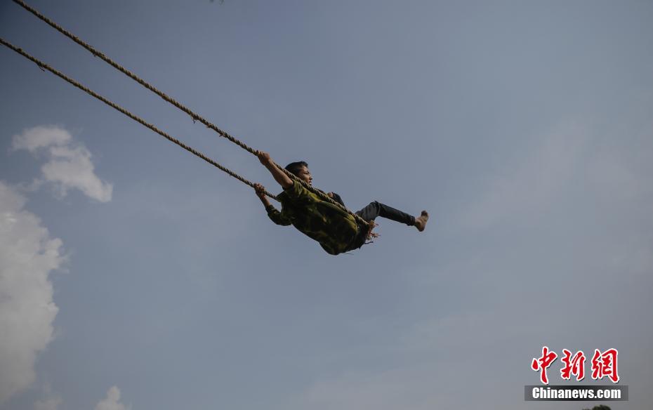 10月11日,一位男孩在尼泊尔首都加德满都的一个空地上荡秋千。德赛节的氛围在尼泊尔已经逐渐浓厚,人们会在空地上用竹竿架起高高的秋千,供孩子们玩乐。中新社记者 普拉丹 摄