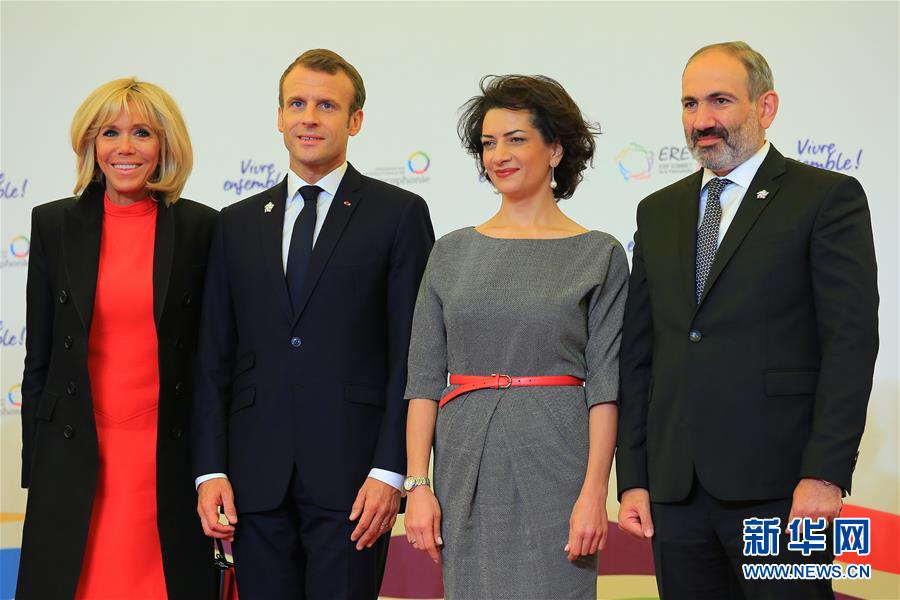 10月11日,在亚美尼亚首都埃里温,法国总统马克龙(左二)与亚美尼亚总理帕希尼扬(右一)在第十七届法语国家组织峰会开幕式上合影。 为期两天的第十七届法语国家组织峰会11日在亚美尼亚首都埃里温开幕,20余位法语国家和地区的领导人出席。 新华社发(格扎拉扬摄)