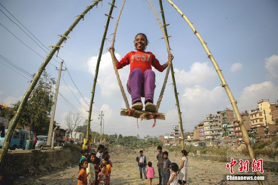 尼泊尔儿童玩转竹竿秋千 喜迎德赛节