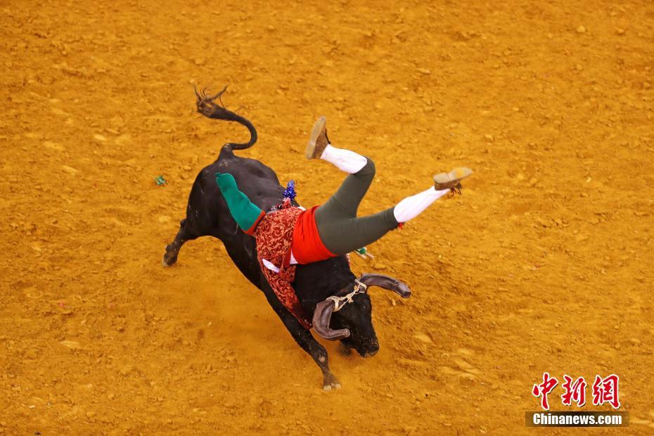 葡萄牙斗牛表演惊险刺激 演员被牛扑倒在地