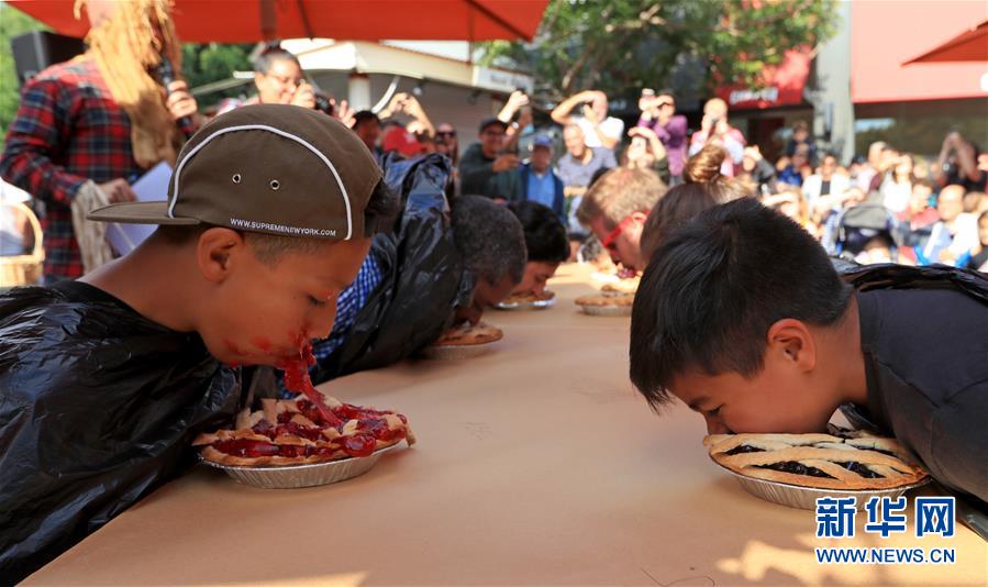 10月13日,在美国洛杉矶,人们参加无手吃派比赛。 新华社记者李颖摄