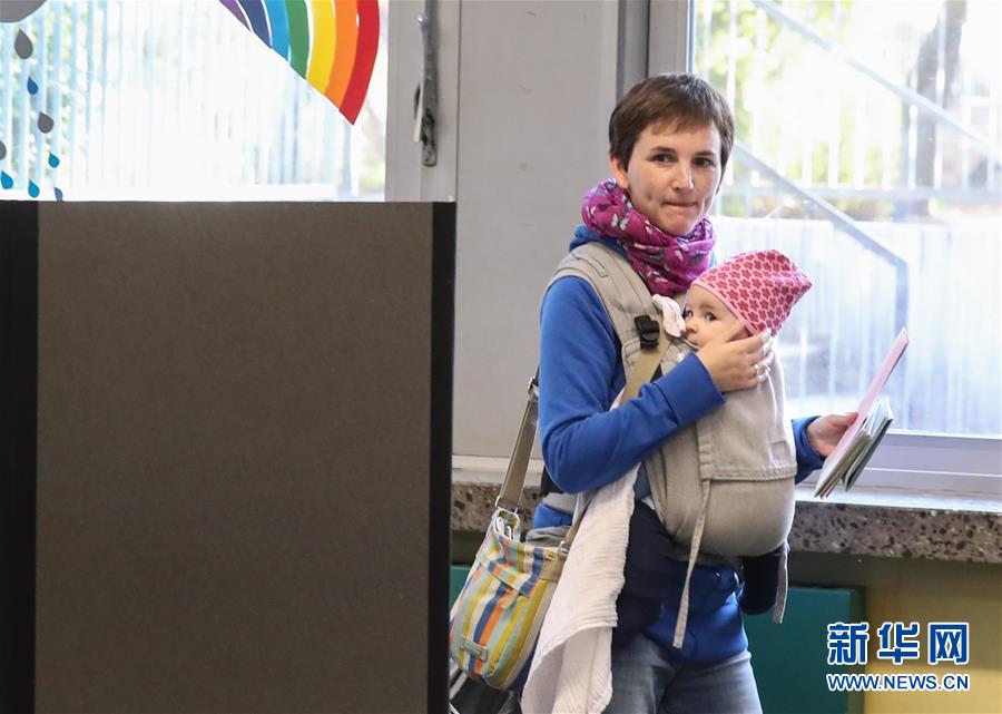 10月14日,在德国纽伦堡,一名带着孩子的选民在一处投票站填写选票后准备投票。 当日,德国南部巴伐利亚州议会选举开始投票。 新华社记者单宇琦摄