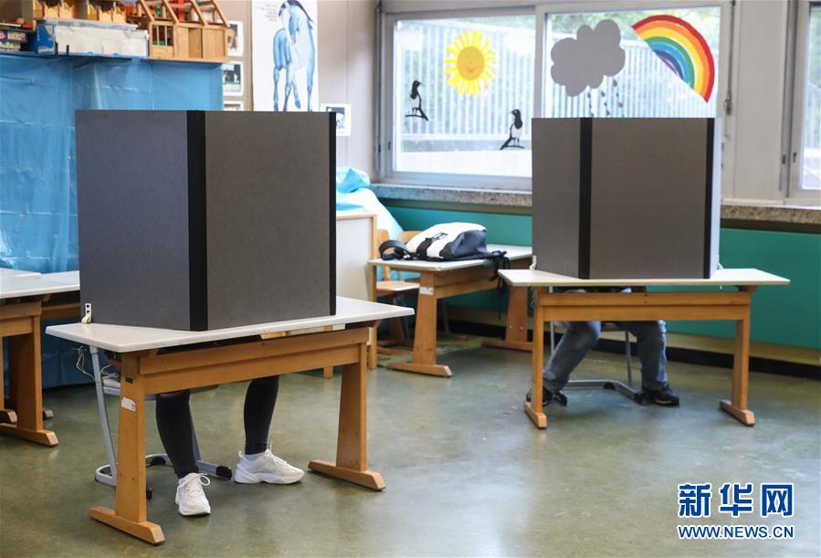 10月14日,在德国纽伦堡,两名选民在一处投票站填写选票。 当日,德国南部巴伐利亚州议会选举开始投票。 新华社记者单宇琦摄