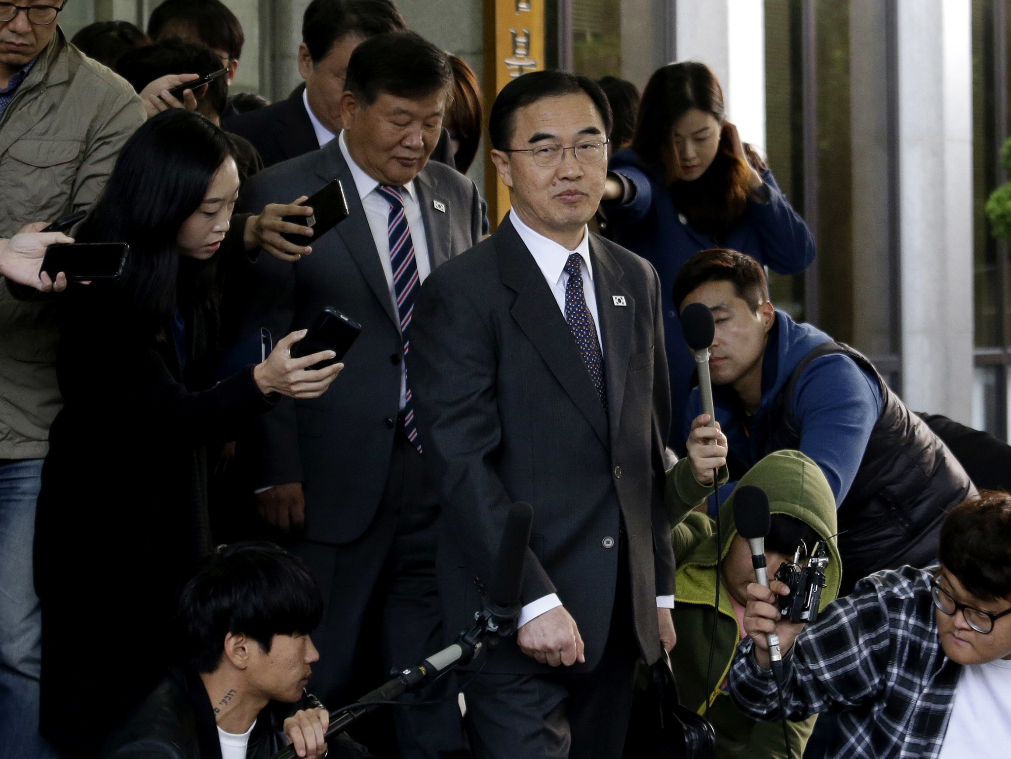 当地时间2018年10月15日,韩国首尔,韩国代表团启程前往板门店,出席韩朝高级别会谈。韩朝高级别会谈今日将在板门店韩方一侧“和平之家”举行。韩方代表团由韩国统一部长官赵明均担任首席代表,朝方代表团由朝鲜祖国和平统一委员会委员长李善权担任团长,双方代表团阵容与6月1日高级别会谈时基本相同。这次朝鲜国土环境保护省副相朴浩英代替祖国和平统一委员会副委员长朴勇一与会,韩方统一部次官千海成代替统一部统一政策室长金南中与会。