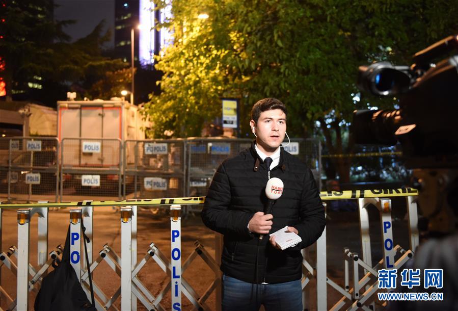 10月15日,在土耳其伊斯坦布尔,一名记者在沙特阿拉伯驻伊斯坦布尔领事馆外工作。 一个土耳其调查小组15日晚进入沙特阿拉伯驻土耳其伊斯坦布尔领事馆,就沙特记者卡舒吉“失踪”事件展开调查。 新华社记者 贺灿铃 摄
