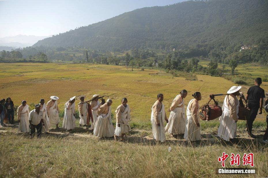 10月15日,尼泊尔帕坦的人们身着节庆服装,走过田间地头,以庆祝诗卡利(Shikali)节。诗卡利节主要由当地尼瓦尔族庆祝,在此期间,祭祀者面带各类神灵的面具,跳舞、宰杀牲畜,以求神灵的庇护与祝福。中新社记者 普拉丹 摄