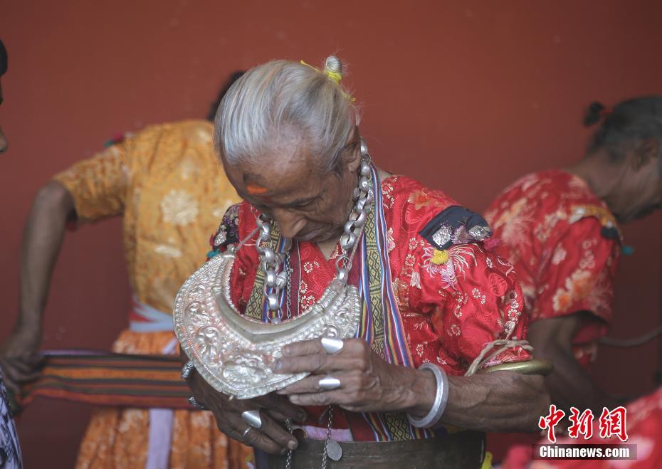 10月15日,尼泊尔帕坦地区的一位老人在整理自己的服饰,以庆祝诗卡利(Shikali)节。诗卡利节主要由当地尼瓦尔族庆祝,在此期间,祭祀者面带各类神灵的面具,跳舞、宰杀牲畜,以求神灵的庇护与祝福。中新社记者 普拉丹 摄