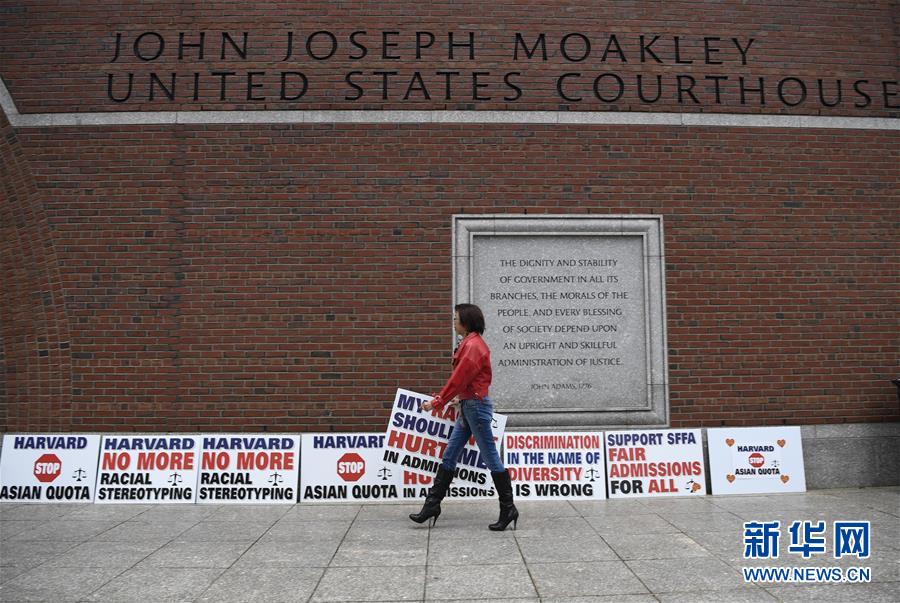 10月15日,在美国马萨诸塞州波士顿,一名反对哈佛大学歧视亚裔学生的抗议者在美国联邦地区法院前手拿标语牌。 新华社记者刘杰摄